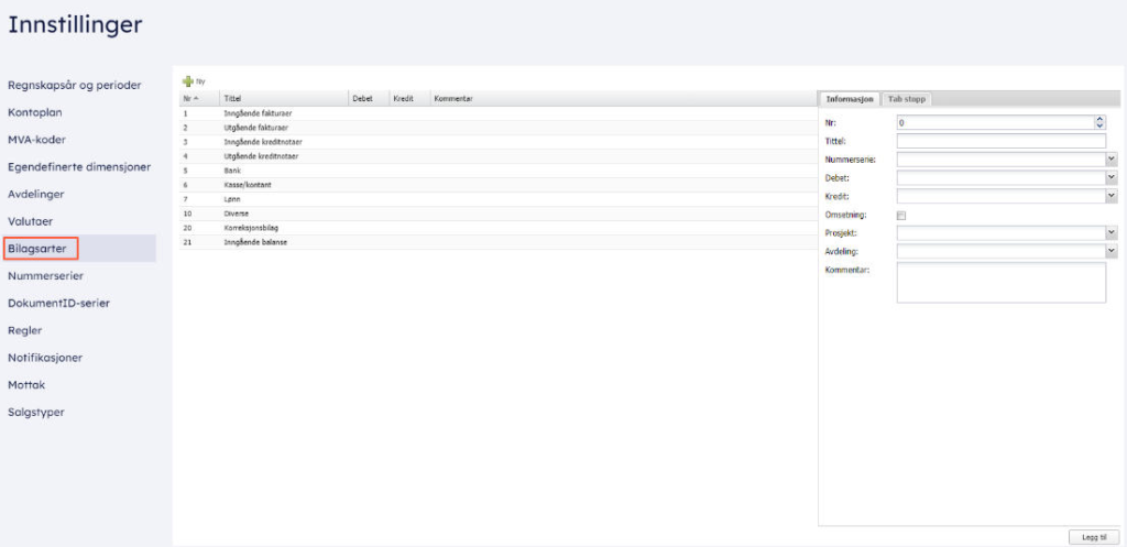Naviger til Regnskap > Administrasjon > Innstillinger > Bilagsarter.