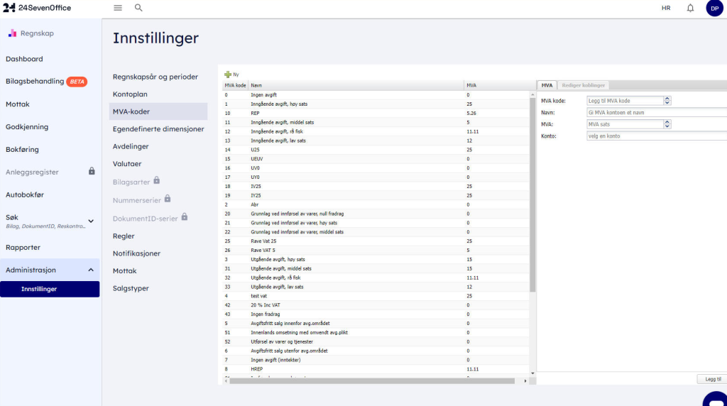 Naviger til Regnskap > Administrasjon > Innstillinger > MVA.