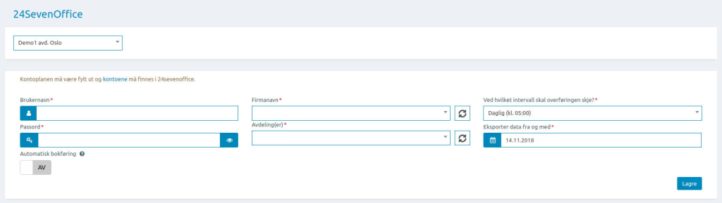 Til slutt så går dere inn på Oppsett > Integrasjoner > 24SevenOffice, legg inn API brukernavn og passord som du bruker i 24SO så får du opp valgalternativ under «Firmanavn» og «Avdelinger».
