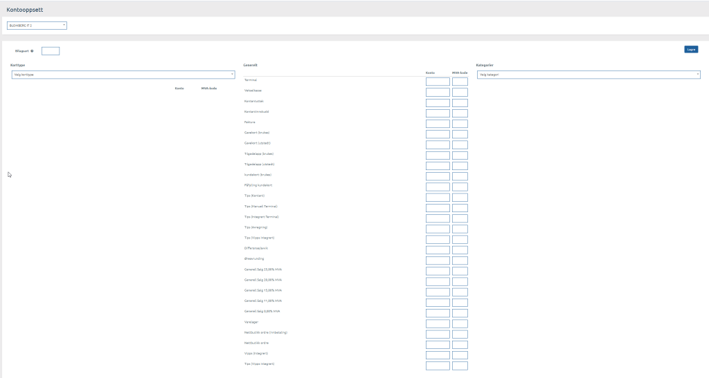 Kontooppsettet i backoffice skal gjenspeile kontoene som er satt opp i 24SO, angi spesifikk konto, MVA koder og Bilagsart.